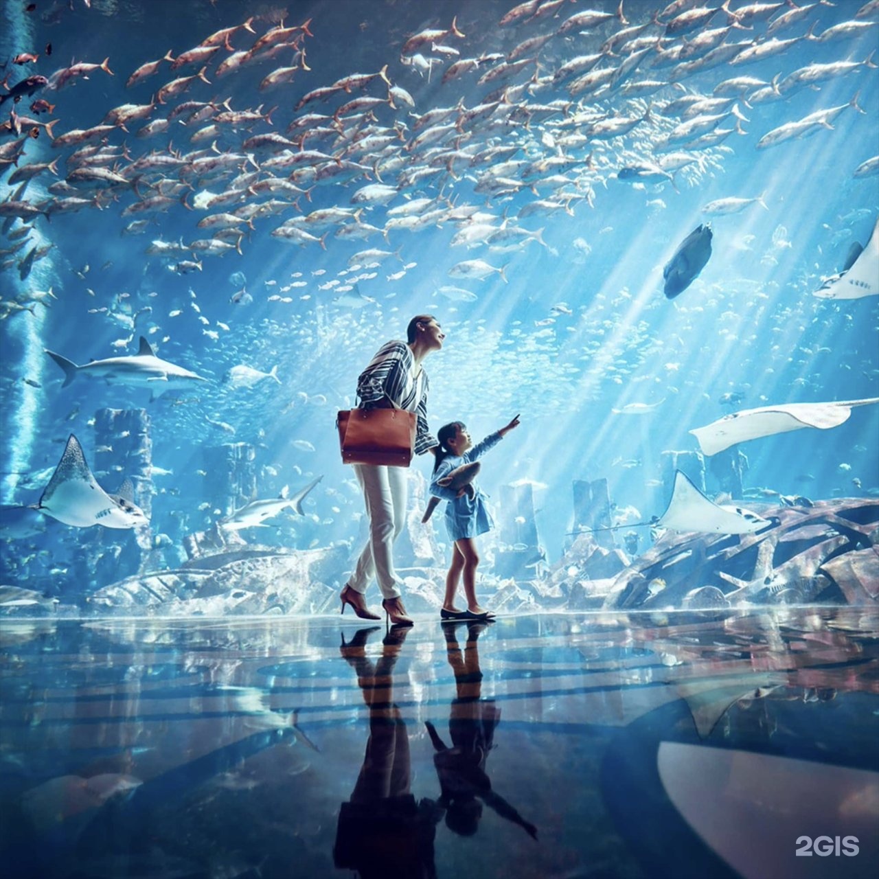 One of the main attractions of the Dubai Mall is the giant Dubai Aquarium on the ground floor, home to more than 33,000 aquatic animals, including the world’s largest collection of sand tiger sharks. You can watch fish in the Aquarium from the mall for free, but it is recommended to buy a ticket to get inside the aquarium tunnels and to the zoo (from 105 AED). Meet the penguins, the King Croc (a 750 kg alligator), and other species, ride a glass-bottom boat or even dive with the sand tiger sharks if you dare.